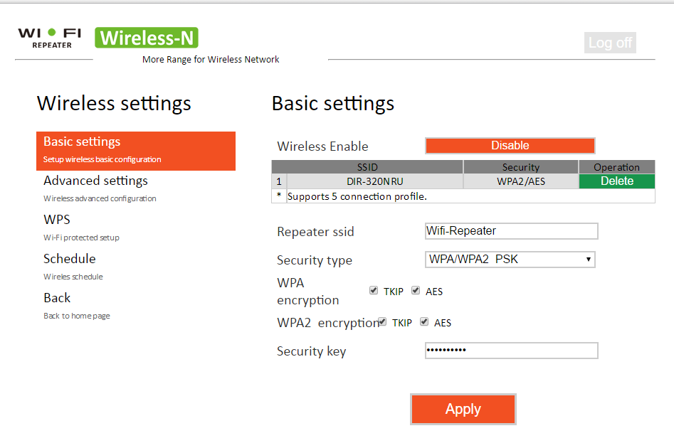 12. Осталось поменять пароль доступа к новой WiFi сети созданной репитером. Для этого на главной странице выберите пункт Basic settings в разделе WiFi и поменяйте пароль в графе Security key.