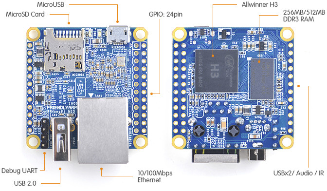 Raspberry Pi Zero имеет два заметных преимущества по сравнению с другими платами Raspberry Pi: она меньше и дешевле. FriendlyARM разработала новую модель для своего семейства NanoPi , которая примерно на 12% компактнее (хотя не такая тонкая из-за разъема Ethernet и USB-коннектора) и значительно быстрее Raspberry Pi Zero. Плата NanoPi NEO основана на четырехъядерном процессоре Allwinner H3.