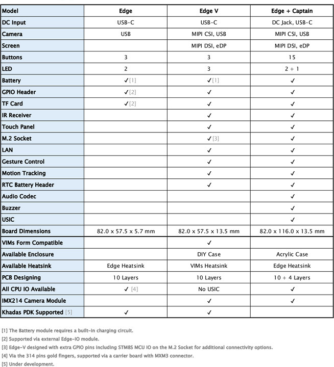 Как уже упоминалось в анонсе Khadas Edge, компания также работает над несущей платой Khadas с разъемом MXM3. Таким образом, есть три варианта развития и хотя компания пока не опубликовала никаких фотографий, но теперь появились более подробная информация о функциях и спецификациях для плат Edge, Edge V и Edge + Captain.