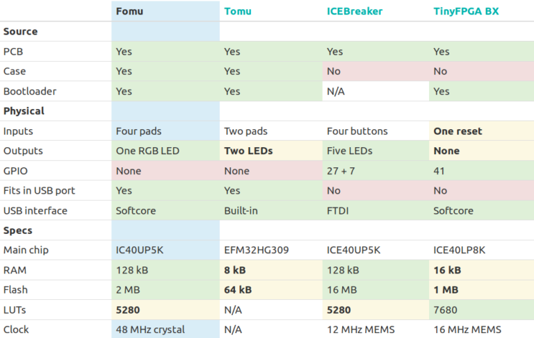 Компания также сравнила Fomu с Tomu и другими платами ICE40, такими как iCEBreaker и TinyFPGA-BX. Если вам нужна максимальная мобильность и вы хотите запускать программное ядро, то Fomu будет выглядеть лучше, благодаря более высокой тактовой частоте в сочетании с 128 Кб ОЗУ, но если вам нужны входы / выходы, то Fomu вам не подойдет, поскольку имеет только четыре входа и всего один RGB светодиод, и нет реальных запасных GPIO.