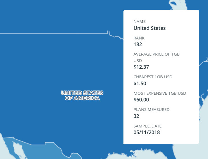 Таким образом, учитывая все эти нюансы, средняя цена за 1 ГБ мобильных данных не дает полной информации. Например, в Соединенных Штатах было проанализировано 32 тарифных плана, и, в то время как, средняя цена 1 ГБ данных составила 12,37 долларов США , цены варьировались от 1,50 долларов США за ГБ до 60 долларов США за ГБ.