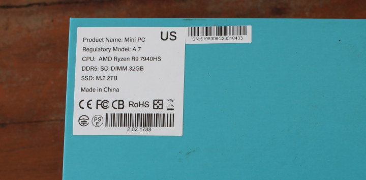 Рекомендуется сверить основные характеристики на дне коробки перед открытием: полученный образец оснащен процессором AMD Ryzen R9 7940S, 32 ГБ DDR5 SO-DIMM и SSD M.2 на 2 ТБ, что соответствует заявленному.