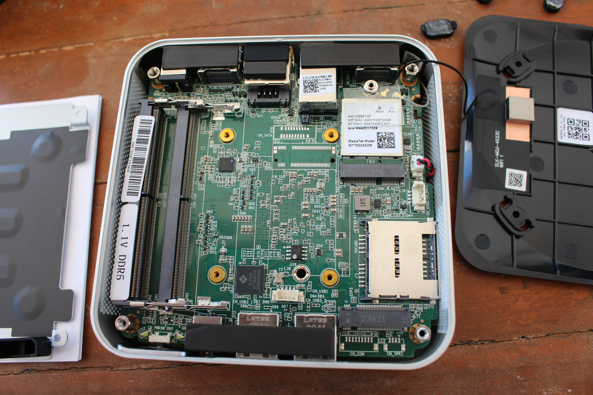 Образец комплектовался двумя модулями Crucial DDR5-5600 по 16 ГБ и SSD ACER. После их извлечения можно осмотреть материнскую плату и модуль Wi-Fi.