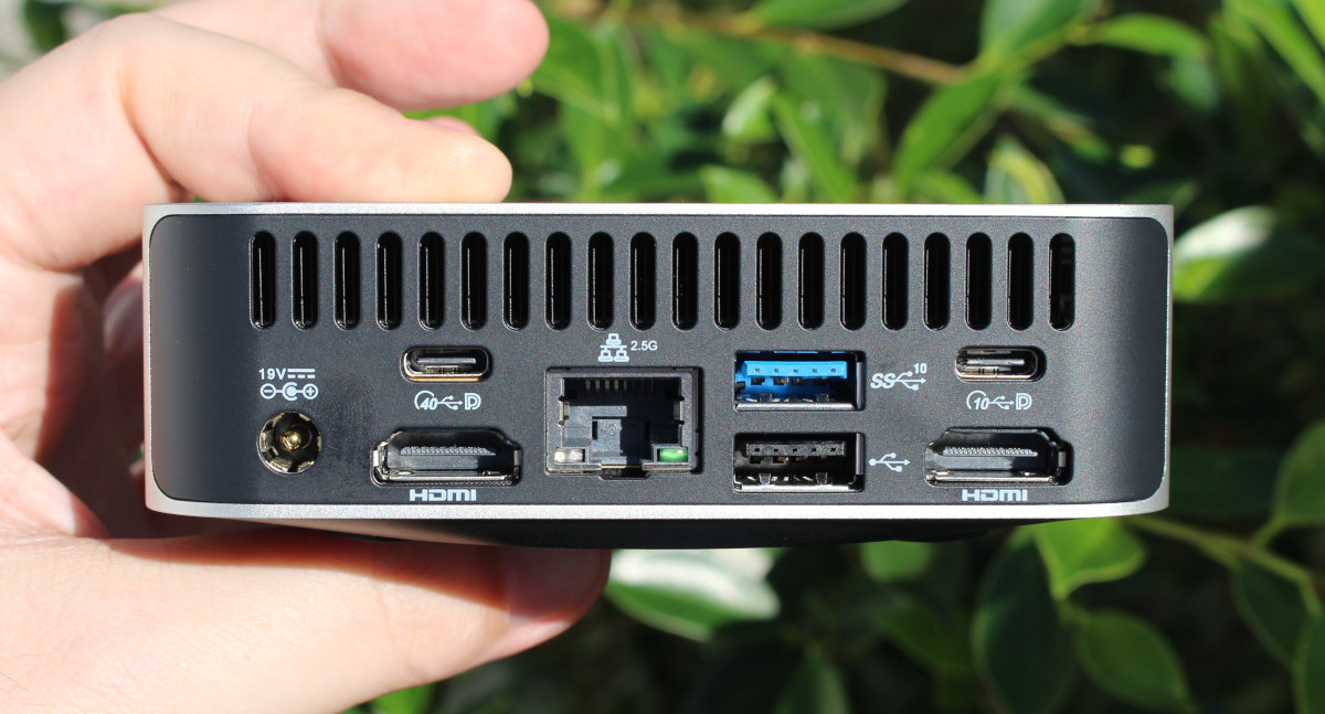 Задняя панель содержит большинство портов (слева направо): разъем питания 19 В DC, порт USB4 с DisplayPort Alt. Mode, HDMI 2.0, разъем 2.5GbE RJ45, порт USB 3.2 Type-A, USB 2.0 Type-A, USB 3.2 Type-C с DisplayPort Alt. Mode и второй HDMI 2.0. Верхняя крышка также оснащена вентиляционными отверстиями.