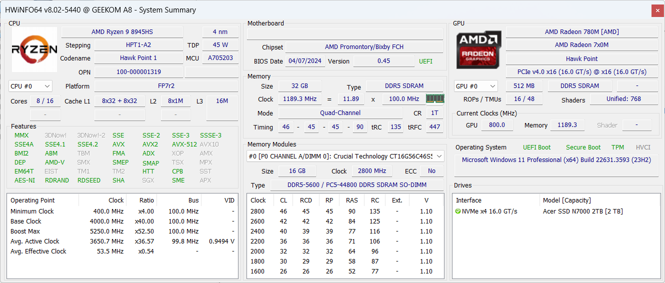 HWiNFO64 предоставляет детали о 8-ядерном/16-поточном процессоре AMD Ryzen 9 8945HS, материнской плате, встроенной графике AMD Radeon 780M, памяти (2x 16 ГБ DDR5-5600) и накопителе (Acer SSD N7000 2 ТБ).