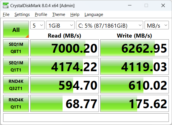CrystalDiskMark для SSD 2 ТБ NVMe: впечатляющие 7000 МБ/с (последовательное чтение) и 6262 МБ/с (запись). Это наивысшая производительность среди протестированных мини-ПК. Случайные операции также хороши, хотя накопитель WD PC SN740 NVMe в Khadas Mind Premium лучше в тестах RND4K.