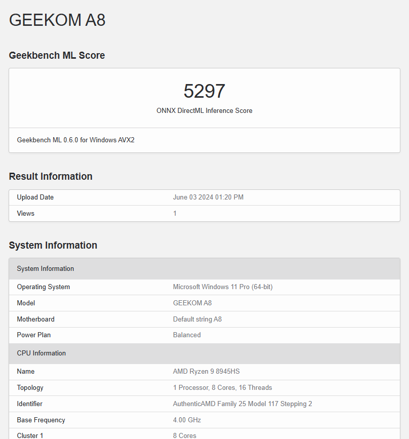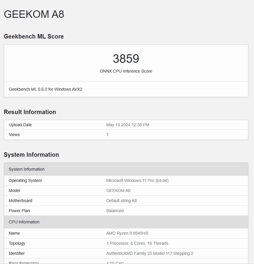 С учетом NPU 16 TOPS в AMD Ryzen 9 8945HS (до 39 TOPS) протестированы ИИ-нагрузки. Geekbench ML 0.6.0 на CPU: 3859 баллов .
