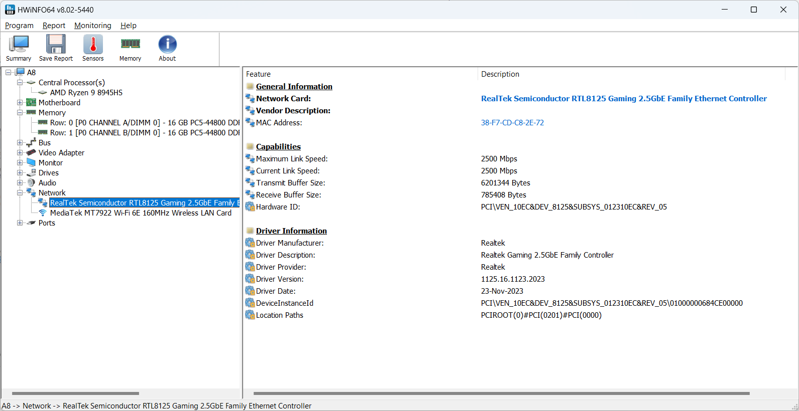 GEEKOM A8 оснащен контроллером RealTek RTL8125 2.5GbE (Rev 05).
