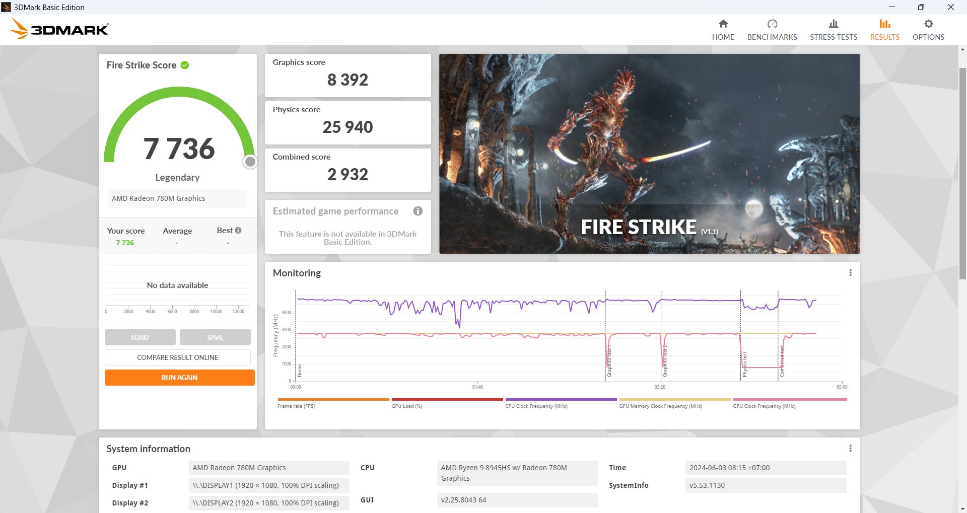 | 3DMark (Fire Strike) | 7736 | 8534 | 4982 | 5387 | 5427 |
