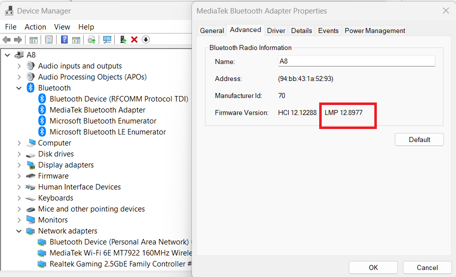 Версию Bluetooth можно проверить в Диспетчер устройств->Адаптер MediaTek Bluetooth->Дополнительно.
