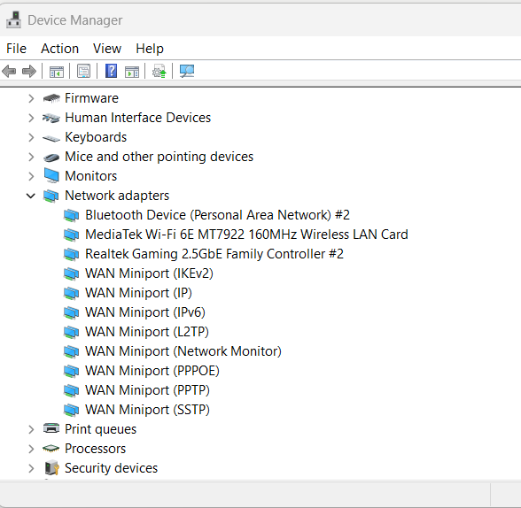 В разделе Диспетчер устройств->Сетевые адаптеры видны контроллер 2.5GbE Ethernet, WiFi 6E и Bluetooth.
