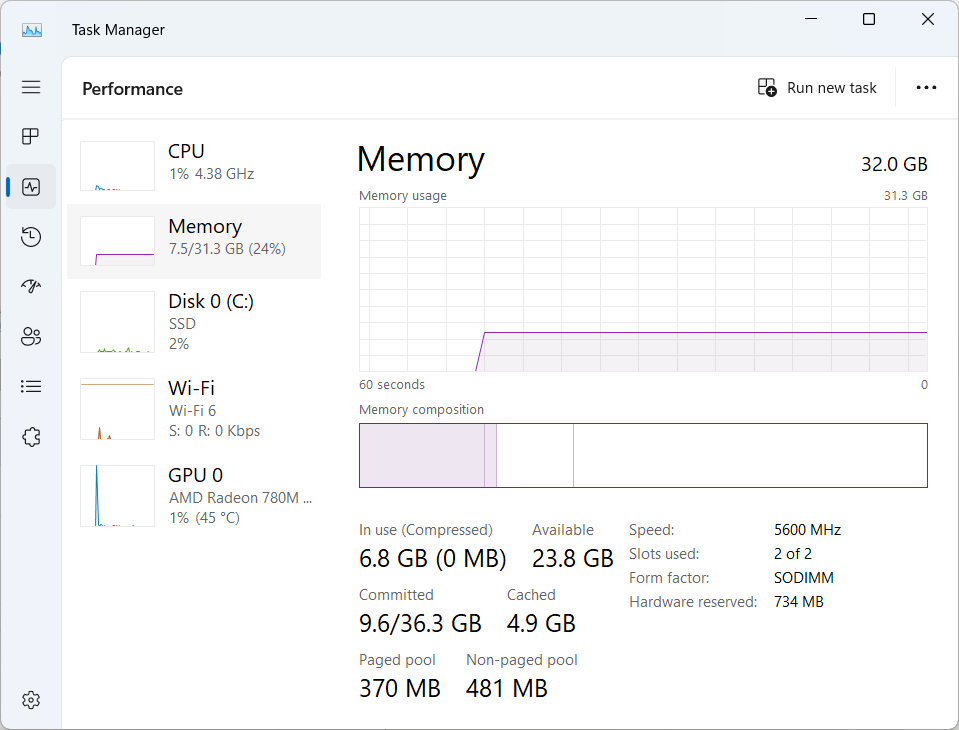 Диспетчер задач Windows подтверждает наличие 32 ГБ ОЗУ (доступно 31.3 ГБ) с частотой 5600 МГц в двух модулях SODIMM. NPU здесь не отображается, но обнаруживается в HWiNFO64.