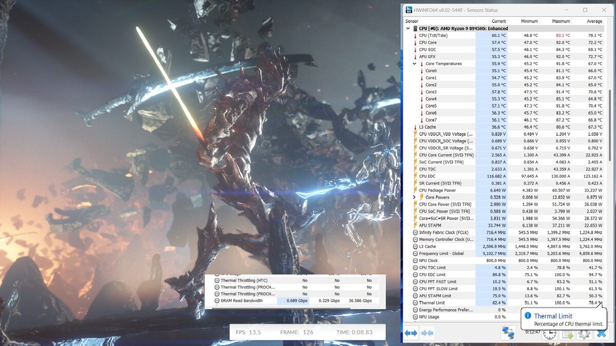 При запуске 3DMark Fire Strike под нагрузкой CPU+GPU максимальная температура процессора составила 93.1°C без теплового троттлинга (HWiNFO64).