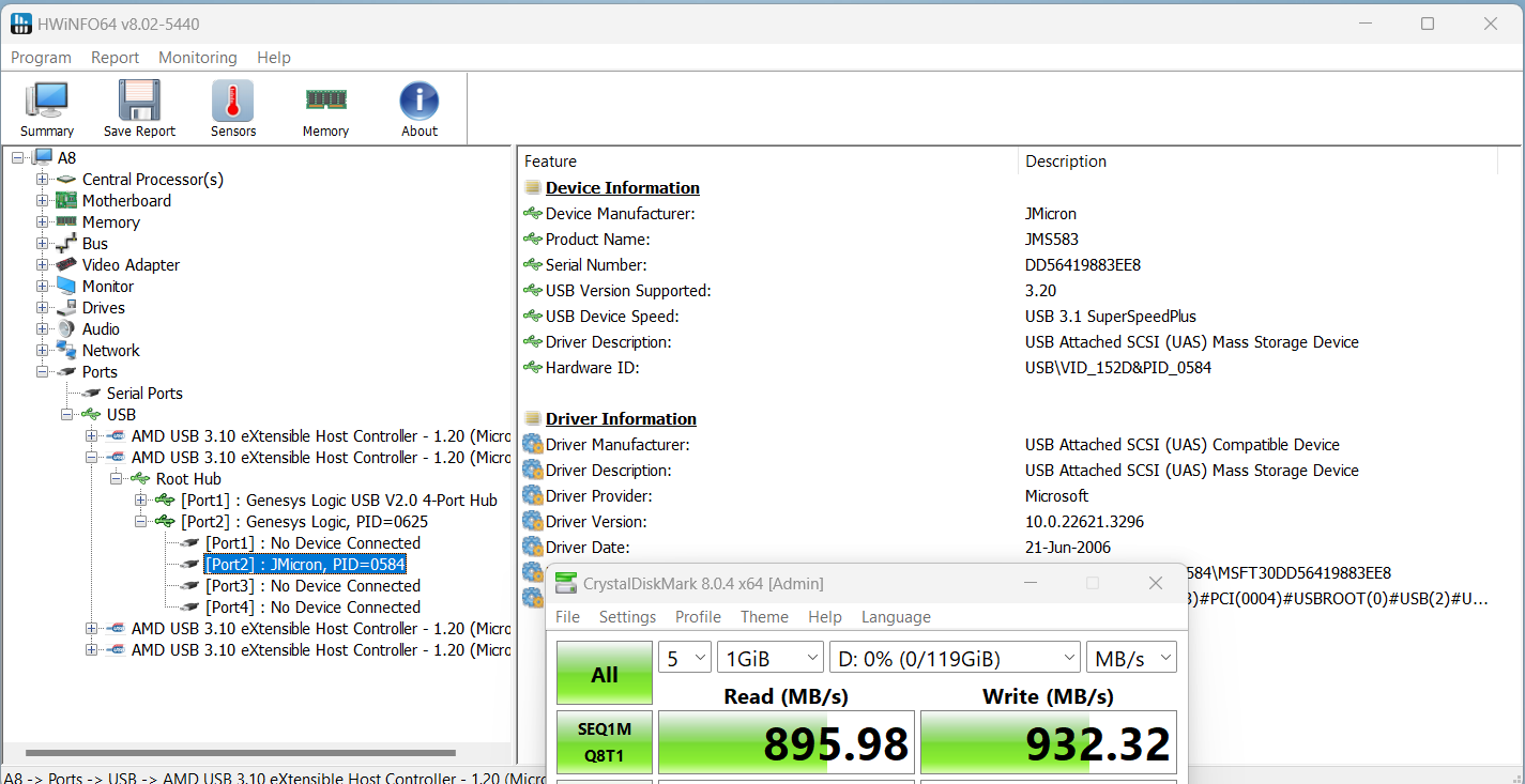 - USB-A #1 – USB 3.2 – USB 3.1 SuperSpeedPlus (10 Гбит/с) – Скорость чтения: 895 МБ/с; записи: 932 МБ/с