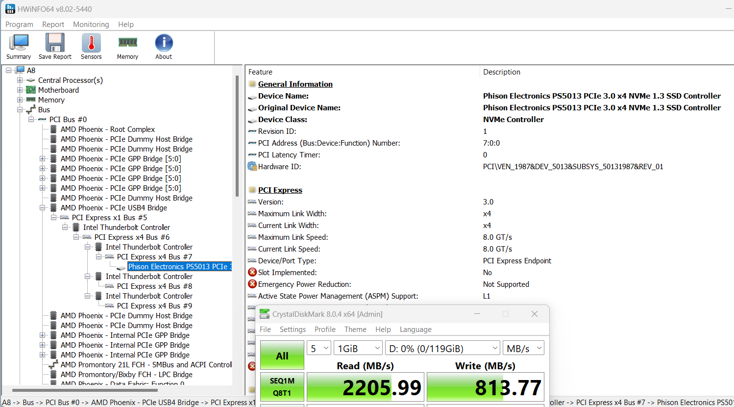 - USB-C #1 – USB4 (40 Гбит/с) – Thunderbolt/NVMe 8GT/s – Скорость чтения: 2205 МБ/с; записи: 813 МБ/с