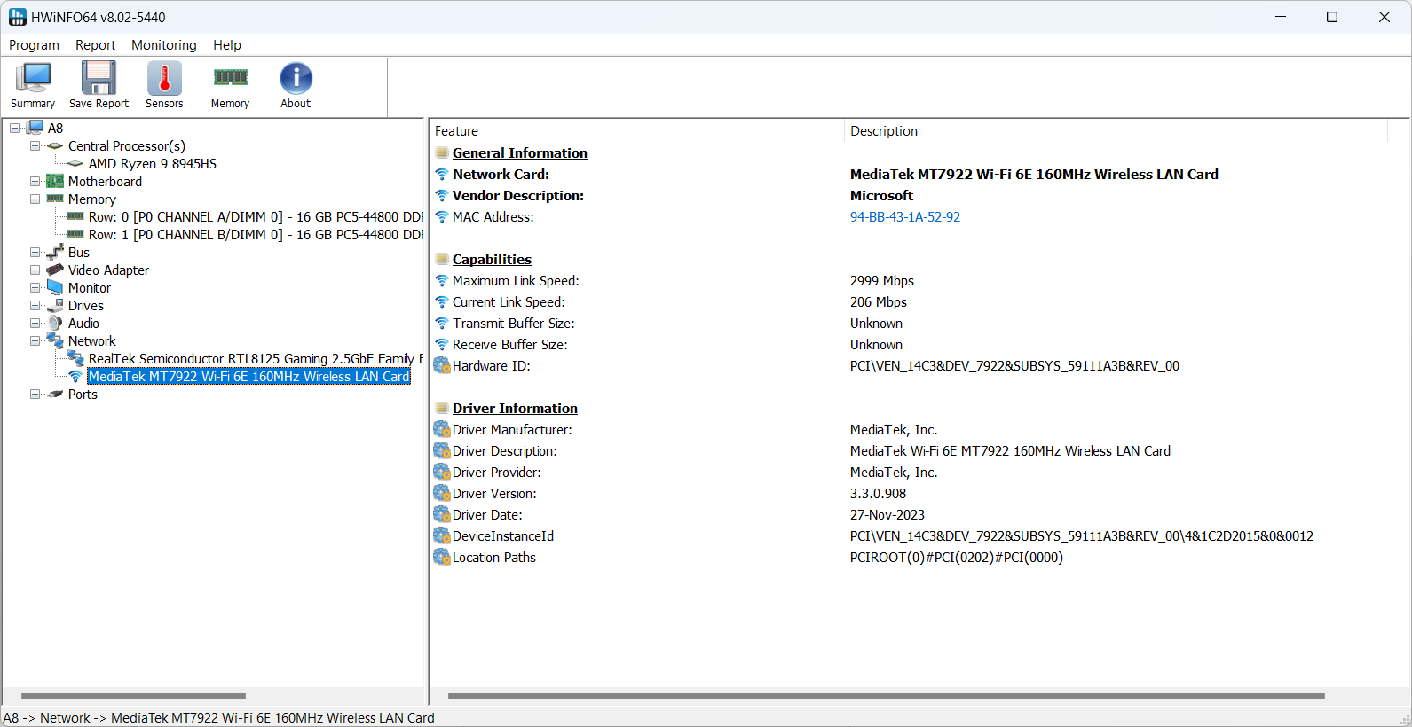 Беспроводной модуль MediaTek MT7922 WiFi 6E поддерживает скорость до 2999 Мбит/с, но на момент скриншота соединение составляло 206 Мбит/с из-за удаленности от роутера. При разборке идентифицирована модель «Azurewave AW-XB591NF».