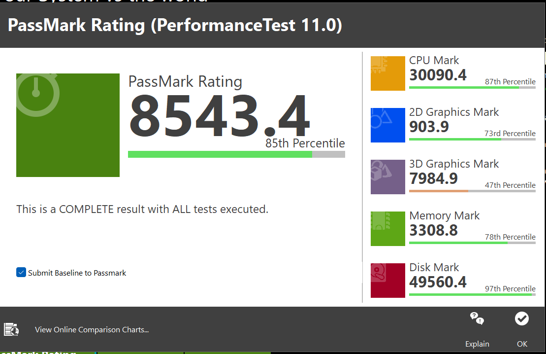 PassMark PerformanceTest 11: 8543.4 балла с выдающимся Disk Mark (97-й процентиль), значительно повлиявшим на общий рейтинг.