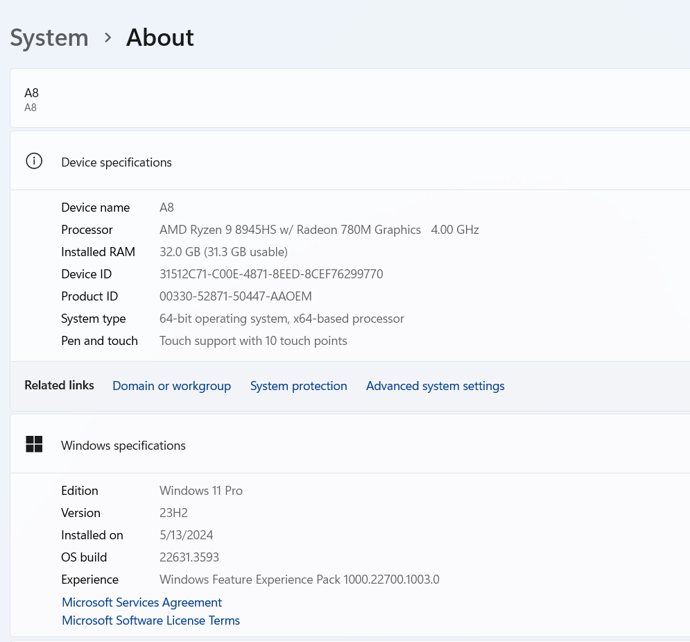 Окно Система->О системе в настройках подтверждает конфигурацию: мини-ПК A8 с процессором AMD Ryzen 9 8945HS (базовая частота 4.0 ГГц), графикой Radeon 780M, 32 ГБ ОЗУ под Windows 11 Pro 23H2 сборка 22631.3593.