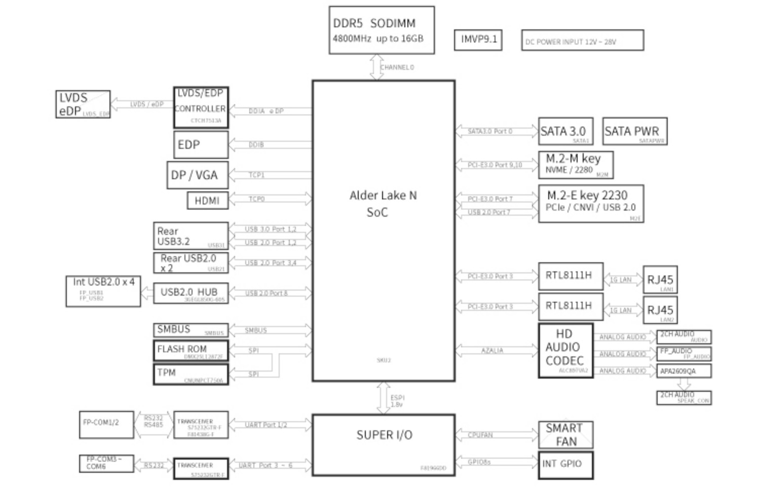 Плата поддерживает до 32 ГБ памяти DDR5 4800 МГц, тройные конфигурации дисплеев через HDMI 2.0b, DP 1.4 и 24-битный двухканальный интерфейс LVDS/eDP, а также предлагает порт SATA III и два слота M.2 M-Key для накопителей NVMe или SATA. Она также оснащена слотом M.2 E-Key 2230 для беспроводного расширения с поддержкой CNVi, двумя портами Gigabit Ethernet и набором интерфейсов ввода-вывода, включая шесть COM-портов, два USB 3.2, восемь USB 2.0, 8-битный GPIO, SMBus, watchdog timer и другие.