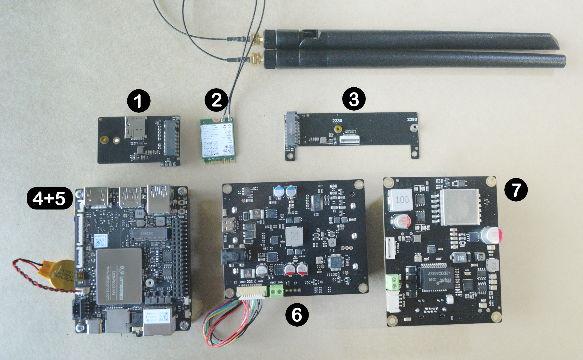 - Плата расширения M.2 M-Key для LattePanda IOTA : Адаптер интерфейса, предназначенный для подключения NVMe SSD или карт ускорения ИИ формата M.2 (размеры 2230 и 2280).