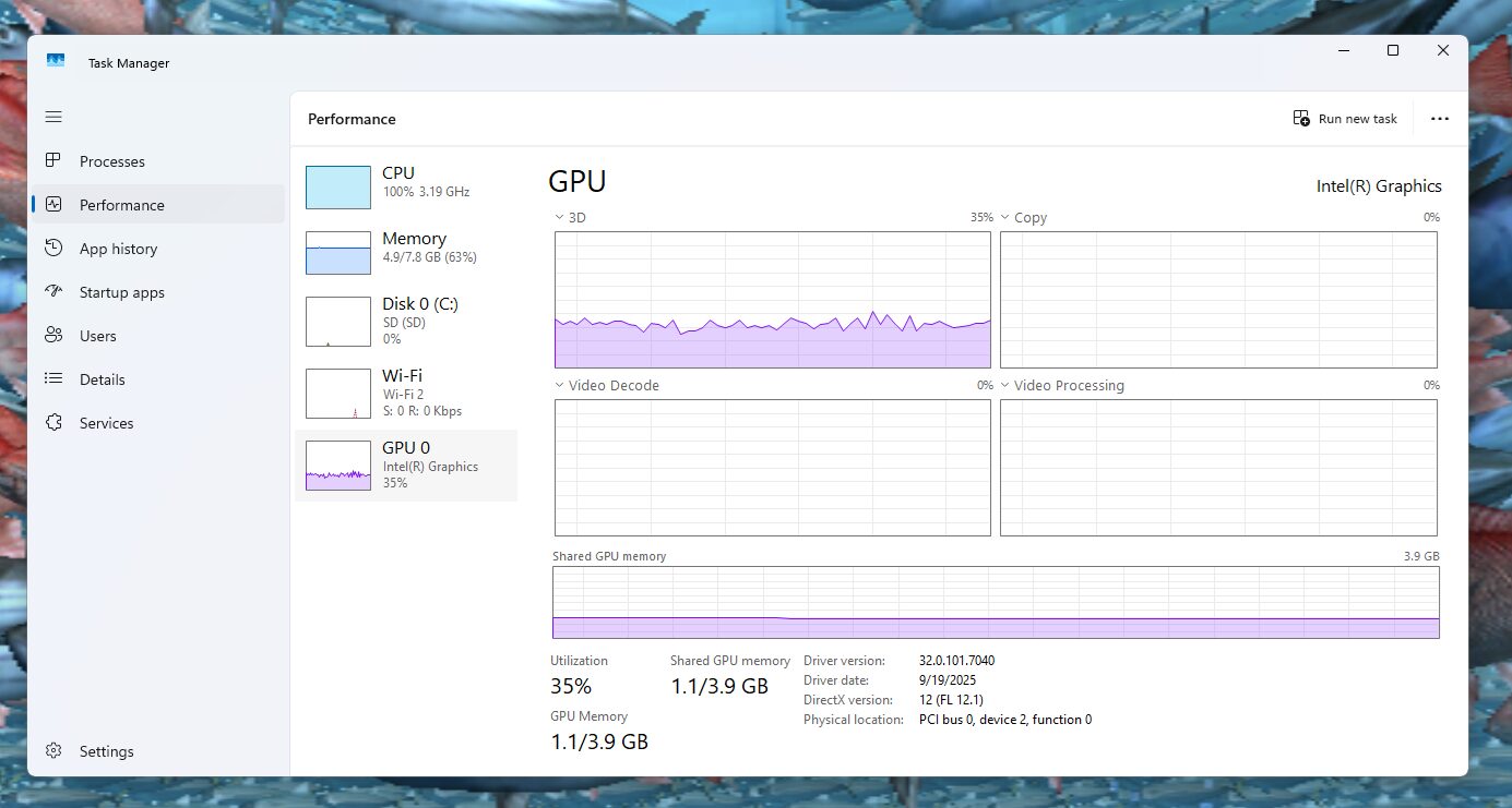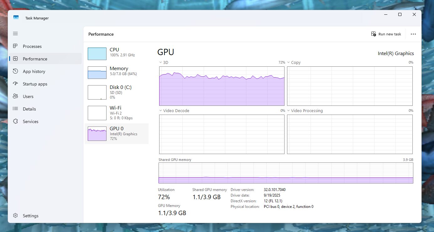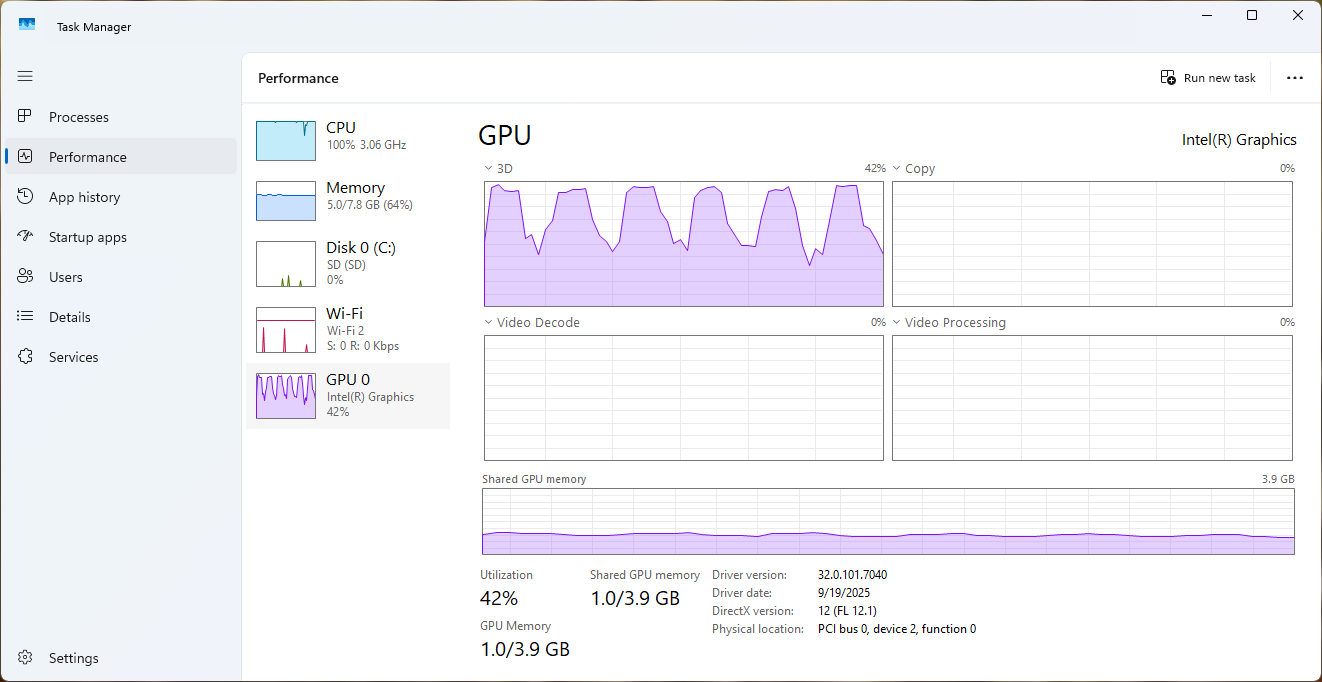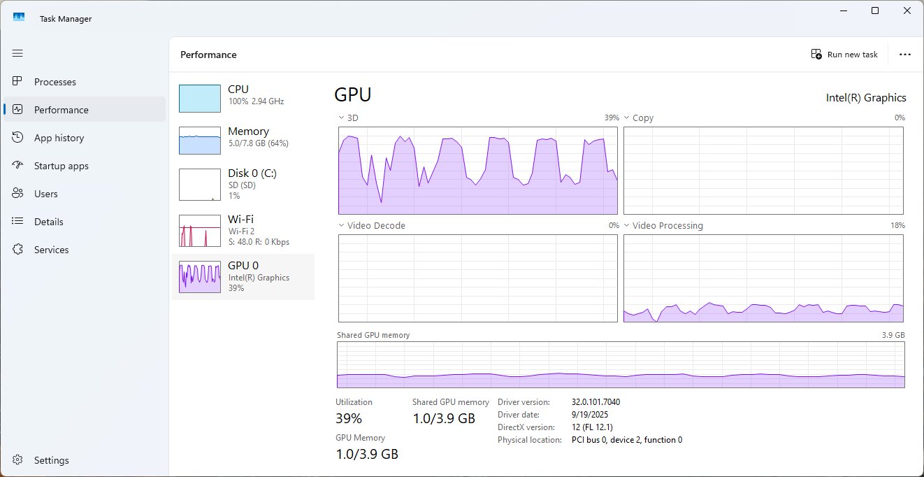 Активность ГП оставалась умеренной при низких разрешениях, в диапазоне 30–45% использования с приблизительно 1.0 ГБ используемой общей памяти при 144p–480p. При 720p нагрузка на ГП увеличилась до 50–60%, а при воспроизведении 1080p использование возросло до 80–90% с потреблением памяти около 1.3 ГБ. Примечательно, что как механизмы Video Decode, так и Video Processing демонстрировали минимальную активность на протяжении всех тестов, подтверждая, что большинство задач декодирования обрабатывались ЦП, а не ГП.