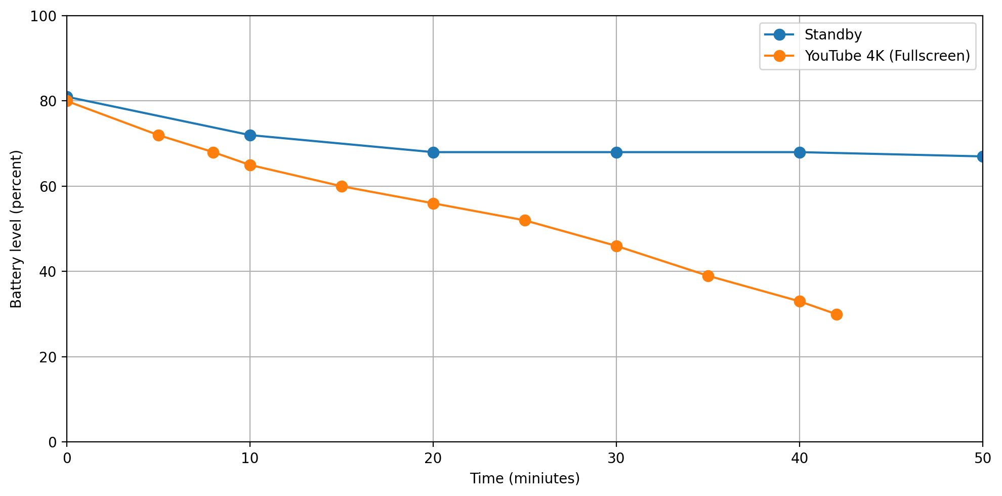 Светодиод статуса батареи – Зеленый=полностью заряжен, синий=разрядка, красный=зарядка.Согласно официальной документации, плата расширения UPS обеспечивает до 2 часов работы при полной нагрузке и примерно 8 часов в режиме ожидания. Для проверки этого было протестировано энергопотребление с использованием трех аккумуляторов 18650, заряженных до уровня 80% по умолчанию, как настроено переключателем DIP на плате по умолчанию. Windows была установлена в режим высокой производительности. Было проведено два теста. В первом тесте все приложения были закрыты, и сетевой адаптер был отключен для записи разряда батареи в режиме ожидания. Затем система была перезаряжена до 80% перед запуском видео YouTube 4K в полноэкранном режиме до тех пор, пока заряд батареи не упал до 30%. Результаты, показанные на рисунке, демонстрируют, что энергопотребление во время воспроизведения 4K было значительно выше, чем в режиме ожидания.