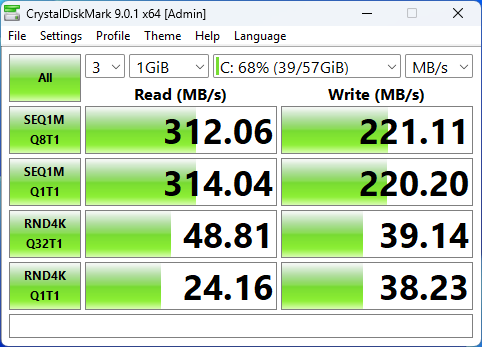 Далее было протестировано внутреннее хранилище с помощью инструмента CrystalDiskMark 9.0.1 в конфигурации по умолчанию. Результаты показали, что eMMC на 64 ГБ достигла скоростей последовательного чтения и записи около 312 МБ/с и 221 МБ/с соответственно, при этом производительность случайных операций 4K достигла примерно 49 МБ/с (чтение) и 39 МБ/с (запись). Эти результаты демонстрируют надежную и стабильную производительность для устройства хранения на основе eMMC.