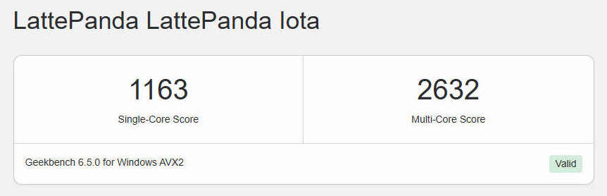 Поскольку LattePanda заявляет, что SBC может достигать 1193 баллов (одноядерный) и 2820 баллов (многоядерный) в тестах Geekbench 6, было решено проверить эти результаты. Была установлена Geekbench 6.5.0 для Windows и запущены тесты ЦП и ГП на LattePanda IOTA. В ходе тестов ЦП достиг одноядерного результата в 1163 балла и многоядерного результата в 2632 балла, что немного ниже официальных результатов. Разница могла быть вызвана прошивкой, фоновыми процессами или различиями в тестовой среде (например, температура окружающей среды).