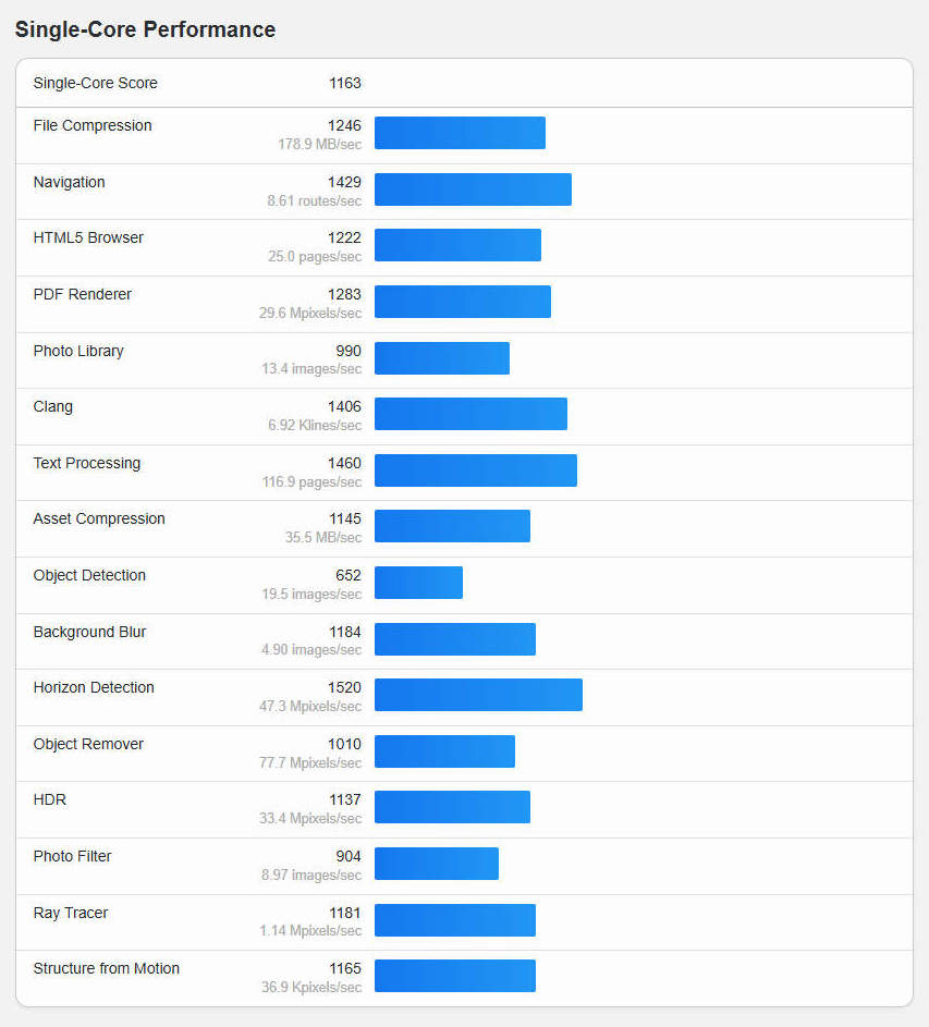 Несмотря на то, что результаты тестов были немного ниже официальных цифр, общая производительность оставалась плавной и стабильной. Дополнительная информация из результатов Geekbench показана ниже. Одноядерная производительность охватывала широкий спектр повседневных задач с сильными результатами в обработке текста (1460), навигации (1429) и рендеринге PDF (1283).