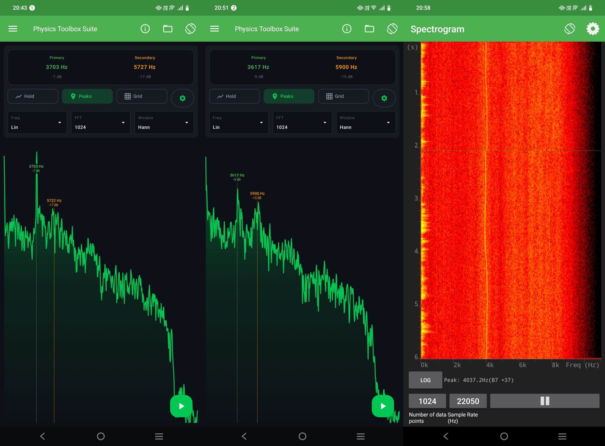 Основная частота шума находилась в диапазоне 3600–4100 Гц, в зависимости от скорости вращения вентилятора. Левое и среднее изображения показывают измерения, выполненные на расстоянии 10 см и 25 см над вентилятором соответственно. Правое изображение представляет собой спектрограмму, показывающую постоянные пики около 3,6 кГц и сдвиги частоты, соответствующие изменениям скорости вращения вентилятора.