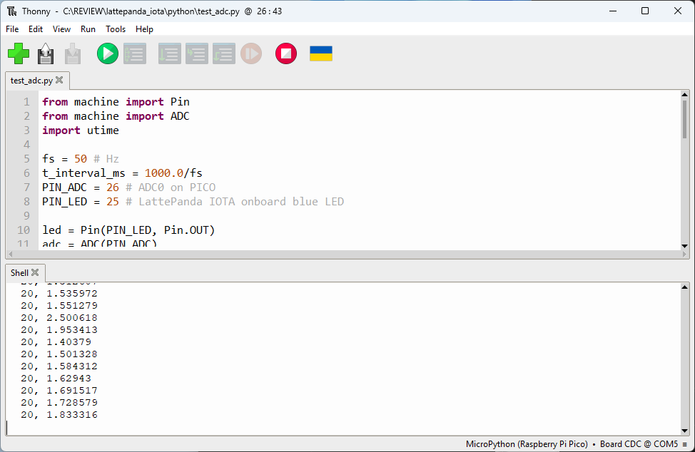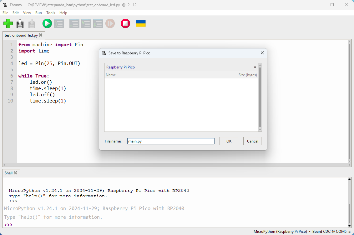 После этого для тестирования встроенного светодиода использовался пример кода мигания, приведенный на странице документации LattePanda IOTA по MicroPython . Когда скрипт назван main.py, он запускается автоматически при включении питания или сбросе МК. Примерный скрипт выполнился успешно без каких-либо проблем.