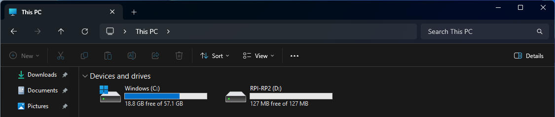 Для управления МК используются две кнопки: кнопка сброса (RST) и кнопка выбора загрузки (BOOTSEL). Эти кнопки можно использовать для загрузки новой прошивки. При удерживании RST, последующем нажатии и отпускании BOOTSEL, и окончательном отпускании RST, операционная система определяет МК как USB-устройство хранения данных с именем по умолчанию RPI-RP2. В этот момент файл прошивки (.uf2) можно загрузить в МК простым перетаскиванием в диск, после чего МК автоматически перезагружается. Последняя версия прошивки MicroPython доступна на официальном сайте MicroPython . Это прошивка для Raspberry Pi Pico, поэтому программирование на MicroPython работает аналогичным образом , а аппаратная часть просто интегрирована в x86-плату.