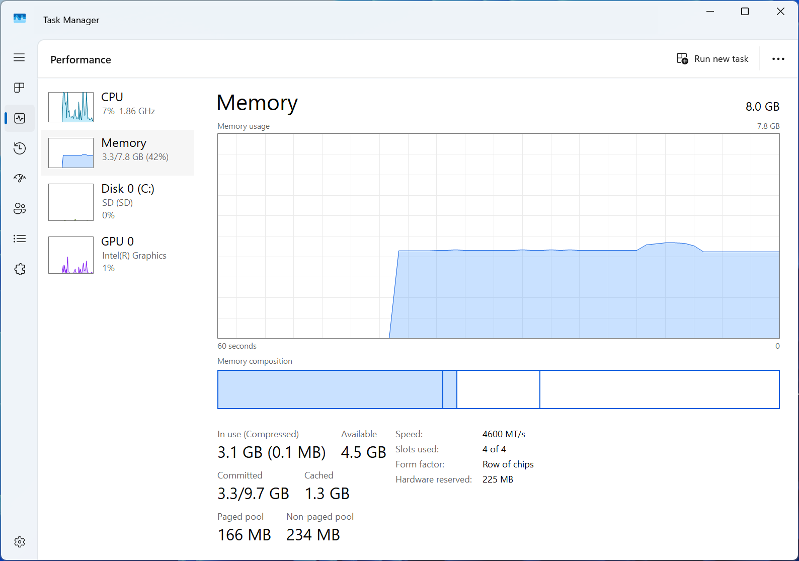 Данные о процессоре и системе, полученные от HWiNFO64.Следует отметить, что Диспетчер задач сообщает, что системная память состоит из 8 ГБ LPDDR5, работающей на скорости 4600 МТ/с, причем примерно 225 МБ зарезервировано для оборудования. При стандартной настройке ОС система использует около 3.3 ГБ из общего объема памяти 8 ГБ в режиме простоя.