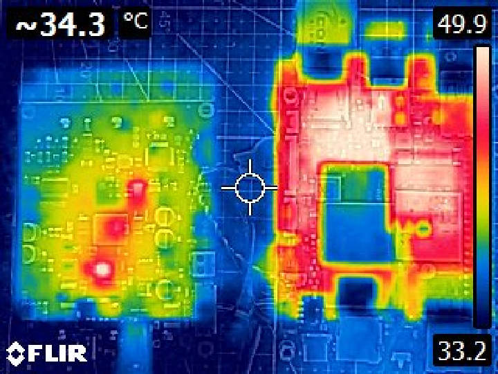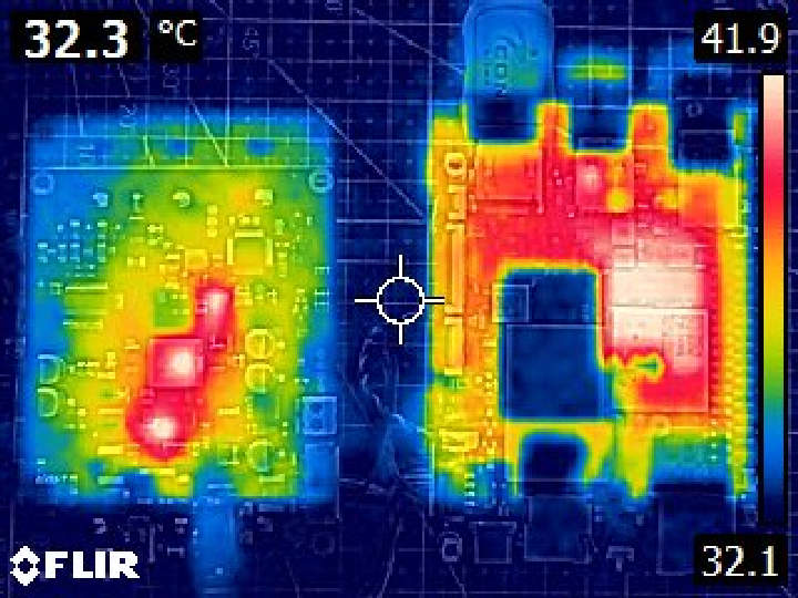 Финальным тестом было измерение температуры и распределения тепла основной платы LattePanda IOTA и платы расширения UPS с помощью тепловизора FLIR E4. Система была загружена и оставлена в режиме ожидания примерно на 10 минут перед захватом первого теплового изображения. Затем было воспроизведено видео YouTube 4K в полноэкранном режиме в течение приблизительно 15 минут, после чего было захвачено второе изображение. На рисунках ниже показаны тепловые картины для обоих условий.