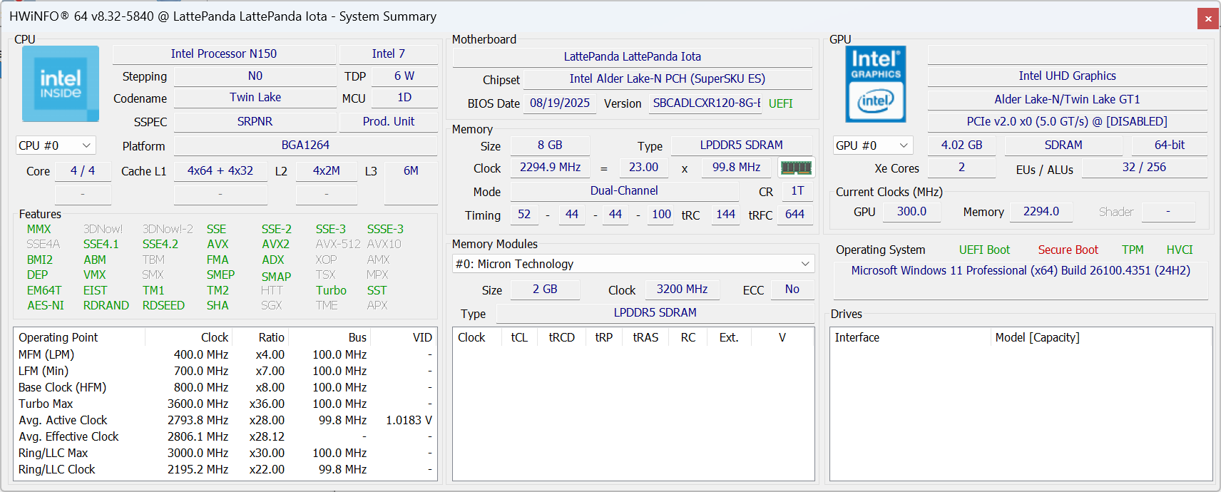 Предустановленная Windows не активирована.HWiNFO64 8.32-5840 подтверждает, что LattePanda IOTA интегрирует четырехъядерный процессор Intel Processor N150 Alder Lake-N (Twin Lake) с графикой Intel UHD Graphics (GT1) и 8 ГБ ОЗУ с тактовой частотой 2294.9 МГц.