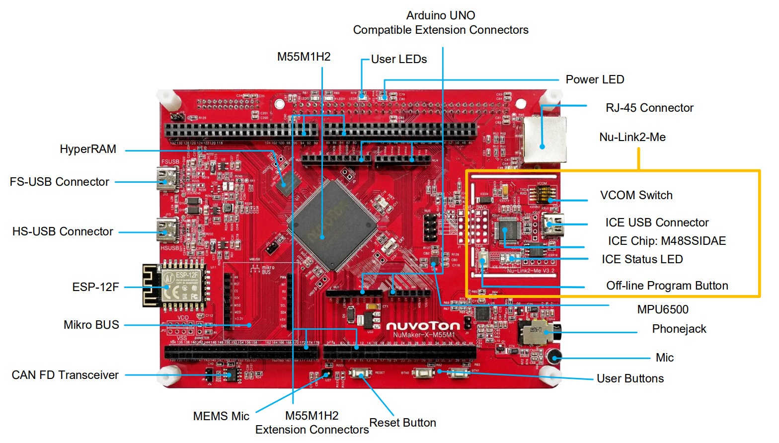 Компания также предоставляет NuMaker-X-M55M1D плату разработки для микроконтроллеров NuMicro M55M1 на основе Arm Cortex-M55 от Nuvoton. Плата предлагает полную расширяемость выводов, совместимые с Arduino UNO разъемы, сокет mikroBUS, HyperRAM, Ethernet PHY, CAN FD, модуль Wi-Fi, аудиокодек, MEMS-микрофон, датчик MPU6500, сдвоенный USB (FS/HS) и слот для карт microSD. Варианты питания включают входы 5В/3,3В и разъем амперметра для измерения потребления в реальном времени. Съемный отладчик Nu-Link2-Me обеспечивает SWD, онлайн/офлайн программирование и VCOM. Также поддерживаются дополнительные модули, такие как 5-дюймовый TFT-дисплей с емкостным сенсорным экраном и CMOS-камера 720p, позволяющие разработчикам быстро тестировать функции HMI, ИИ, сенсорики и подключения.