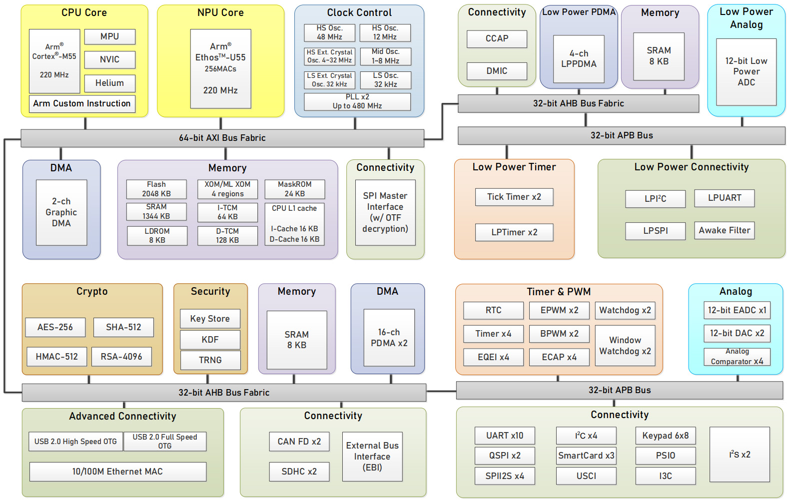 NuMicro M55M1 от Nuvoton — это энергоэффективный ИИ-микроконтроллер, объединяющий 220 МГц ядро Arm Cortex-M55 с NPU Ethos-U55 производительностью 111 GOPS для выполнения базовых ИИ-задач непосредственно на устройстве. Он ориентирован на малые IoT и встраиваемые устройства, требующие энергоэффективной обработки голоса, аудио или простых изображений.