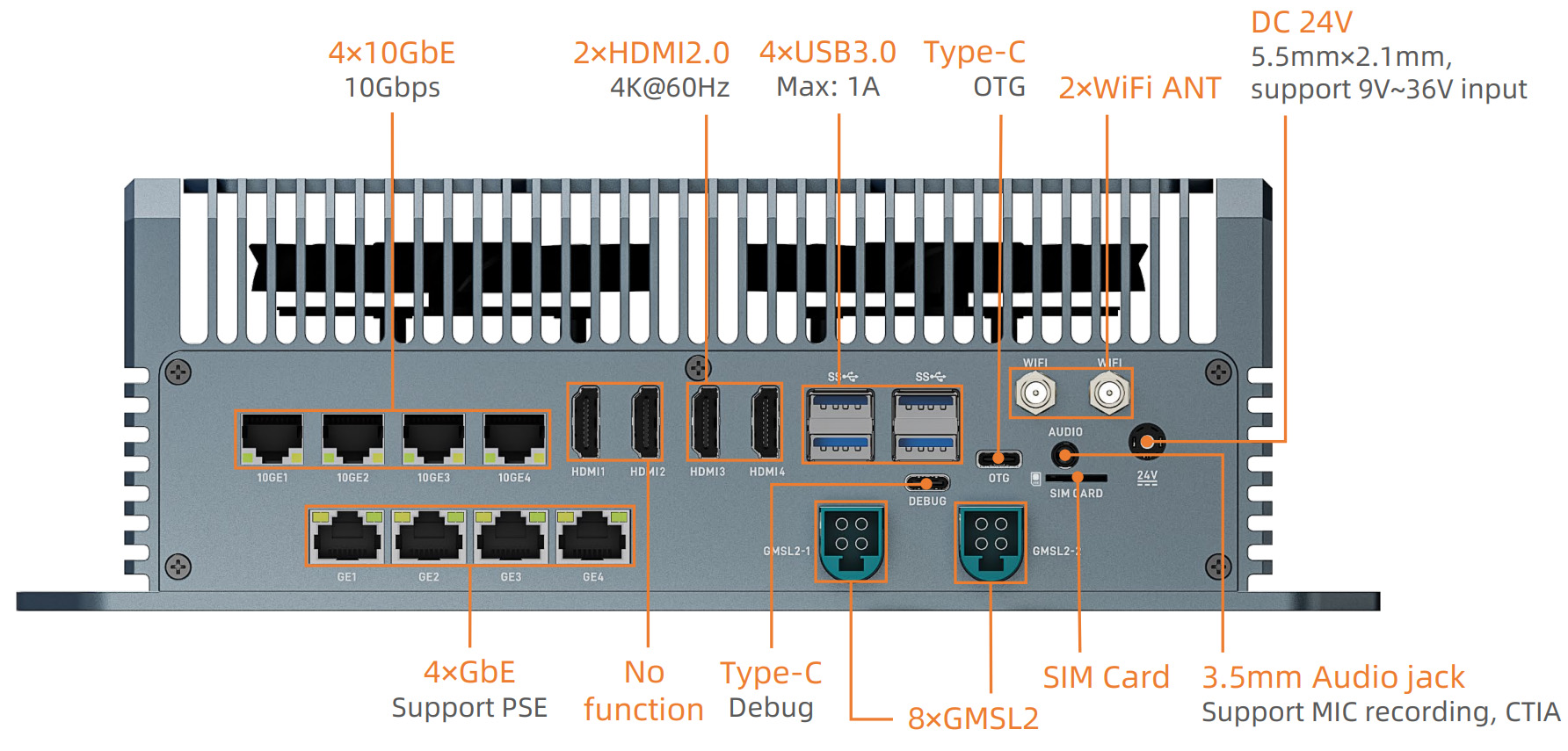 EC-ThorT5000 предоставляет восемь входов для камер GMSL2, четыре порта 10GbE и четыре порта GbE (PSE), двойное хранилище NVMe, HDMI 2.0, USB 3.0, CAN/RS485/RS232, поддержку SIM и опции расширения для 5G, 4G и WiFi 6. Он также предлагает декодирование видео до 92 каналов 1080p в прочном цельном алюминиевом корпусе, предназначенном для круглосуточной работы, что делает его подходящим для робототехники, развертываний в умных городах и задач периферийного ИИ с высокой плотностью.
