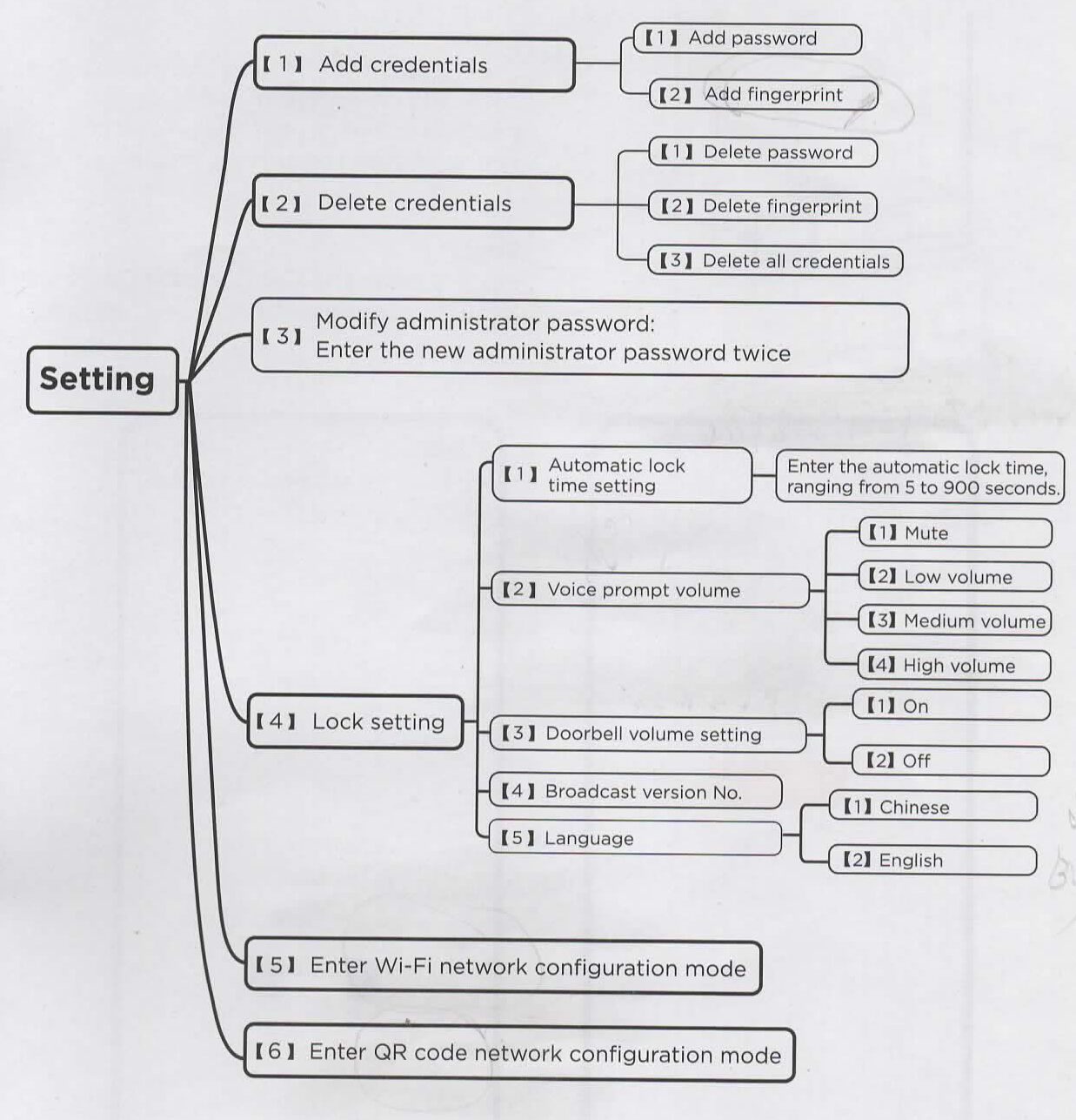 Первоначальная настройка довольно проста. Начните с нажатия кнопки настроек, после чего голосовая подсказка произнесет: «Пожалуйста, установите пароль администратора и нажмите клавишу разблокировки, Ввод…». Затем дважды нажмите [1] для входа в режим добавления пароля (см. диаграмму ниже) и введите 6-значное число. Система попросит подтвердить номер еще раз. Готово. Настройка завершена, и если позже захотите изменить или удалить его, просто нажмите [2] и [1].