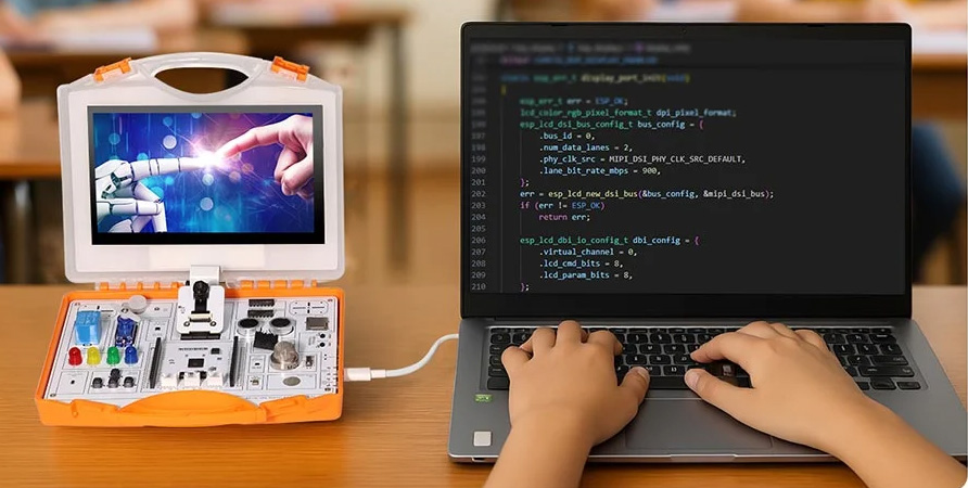 Комплект с открытым аппаратным обеспечением объединяет 7-дюймовый сенсорный дисплей, 2-мегапиксельную камеру и шестнадцать встроенных электронных модулей, поддерживаемых более чем 20 структурированными уроками, которые постепенно охватывают работу с вводами/выводами, аудио, разработку графического интерфейса на LVGL и базовые сценарии использования ИИ. Разработка ведется на языке C с использованием фреймворка ESP-IDF от Espressif, готовых к сборке примеров и модульных драйверов BSP, что делает комплект подходящим для изучения встраиваемых систем, управления устройствами IoT, человеко-машинных интерфейсов, концепций умного дома и приложений Edge AI начального уровня.