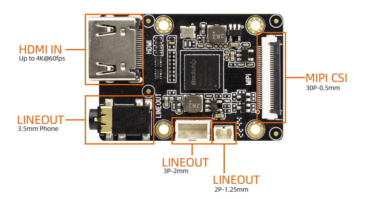 Построенная на базе видео-мостовой микросхемы Rockchip RK628D, плата поддерживает вход HDMI 1.4/2.0 с 8-битным и 10-битным видео, цветовыми форматами RGB888 и YUV420 и разрешением до 4K @ 60 кадров/с. Со стороны выхода она предоставляет интерфейс MIPI-CSI, соответствующий MIPI D-PHY v1.2, с выводом видео в цветовом формате YUV422, поддерживая разрешение до 4K @ 30 кадров/с. Выход аудио доступен через разъем для наушников 3.5 мм и контактные площадки на плате, что делает её подходящей для задач захвата HDMI, умных дисплеев, микропроекторов и приложений встраиваемого преобразования видео.