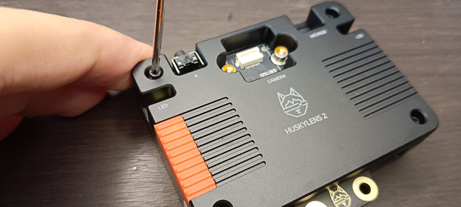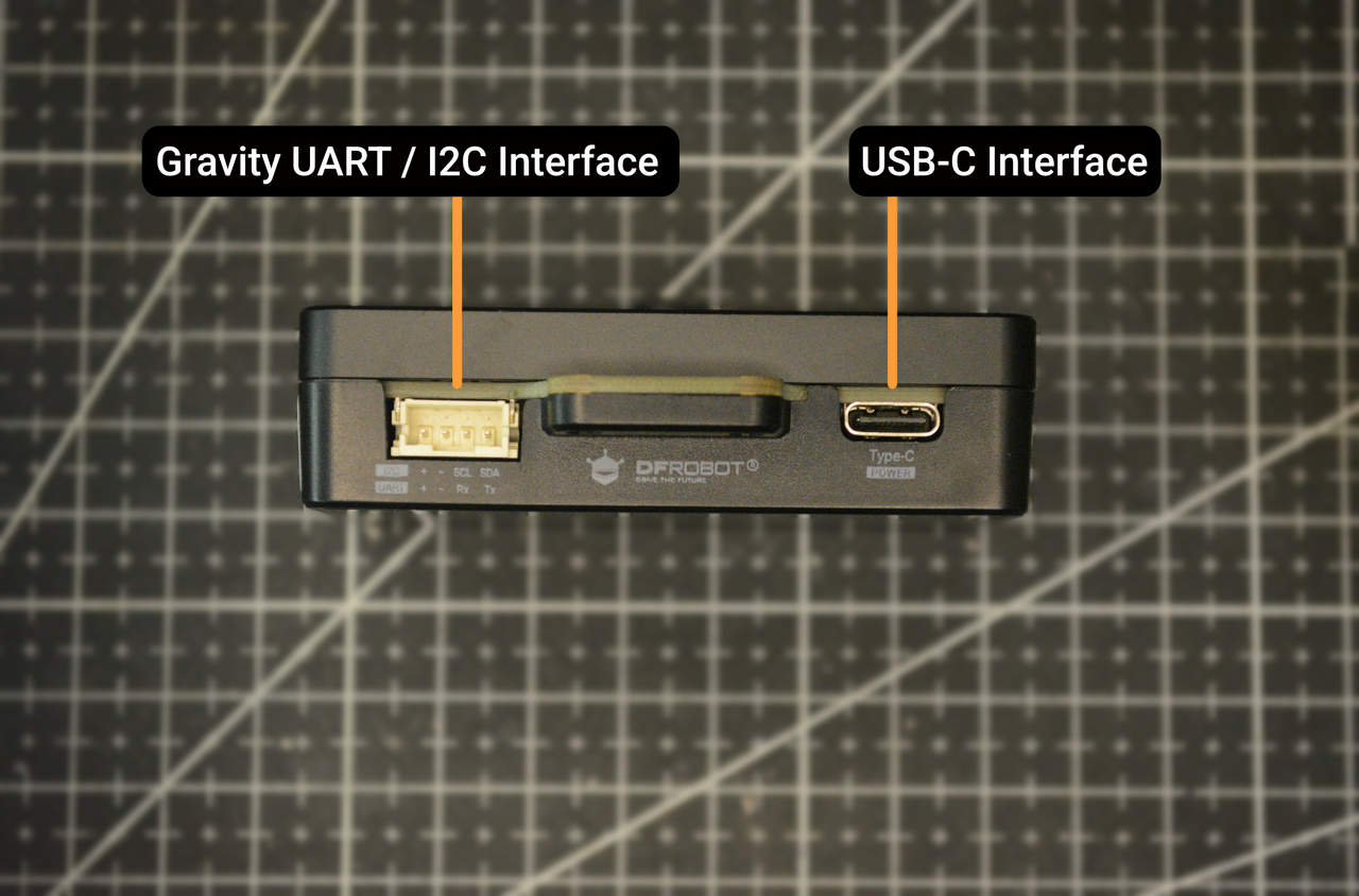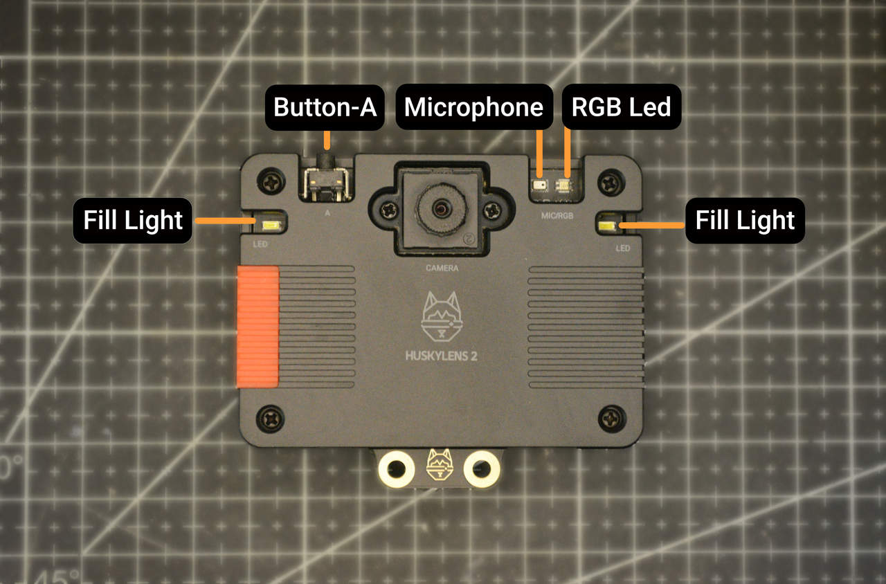 На передней панели HUSKYLENS 2 расположен штатный объектив, один RGB светодиод, два белых светодиода подсветки по бокам корпуса, динамик и микрофон. Сверху находится кнопка с названием Button-A, которую можно использовать для захвата изображения, записи видео или создания снимка экрана. С левой стороны расположен слот для карты памяти microSD. В нижней части HUSKYLENS 2 находятся два основных разъема для связи. Порт USB-C используется для питания и доступа к устройству как к накопителю, а 4-контактный разъем в стиле JST с маркировкой «Gravity» предоставляет интерфейсы I²C и UART.