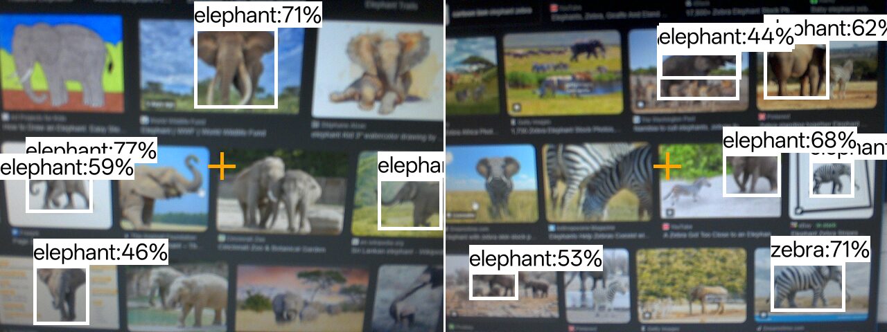 После установки новый пункт меню появился немедленно, и модель работала хорошо. На следующих двух изображениях показаны скриншоты работы этой пользовательской модели, обученной на 10 эпохах. Следует отметить, что, несмотря на размытое входное изображение (из-за неправильного позиционирования устройства и монитора, ограниченного пространством на столе), HUSKYLENS 2 всё равно смог корректно распознать некоторых слонов. Кроме того, поскольку эта пользовательская модель обучалась всего 10 эпох, увеличение их числа должно привести к лучшей производительности.