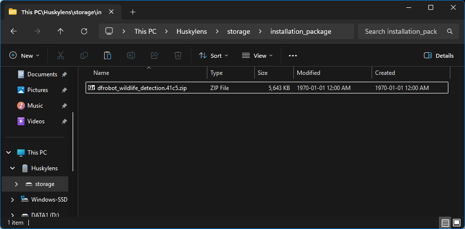 После ожидания в несколько минут инструмент сгенерировал файл dfrobot_wildlife_detection.41c5.zip. Этот ZIP-файл является пользовательским пакетом модели. Чтобы установить его на HuskyLens 2, он был просто скопирован в директорию installation_package устройства.