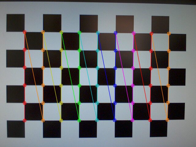 Был захвачен набор изображений 640×480 шахматной доски и обработан с использованием функции калибровки камеры OpenCV в Google Colab.