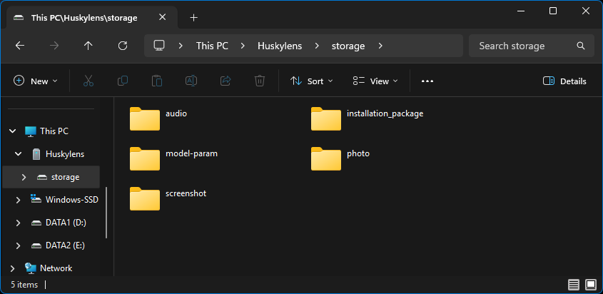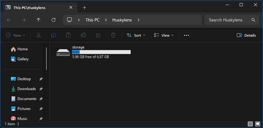 После перезагрузки HUSKYLENS 2 было замечено, что устройство определяется с дополнительным хранилищем на SD-карте, а не только со встроенным накопителем HUSKYLENS 2, как в прошивке v1.1.5. Также было протестировано несколько циклов обновления и отката между версиями v1.2.1 и v1.1.6 — процесс работал надёжно и без проблем.