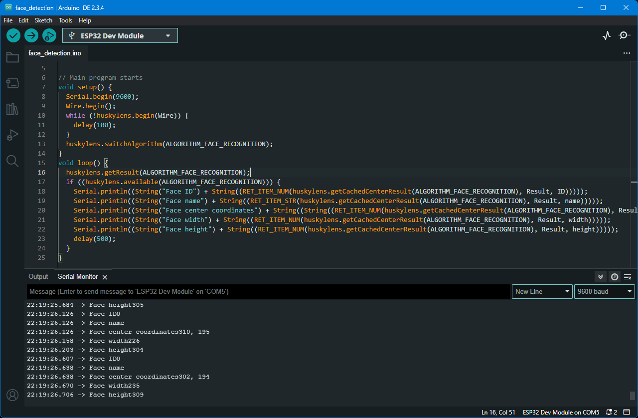 Затем был опробован пример Face Recognition Output Data с официального сайта, и он работал без каких-либо проблем. Компьютер смог получить и извлечь базовую информацию, отправленную с HUSKYLENS 2, включая идентификатор лица, имя и центр ограничивающей рамки, как показано на следующем изображении.