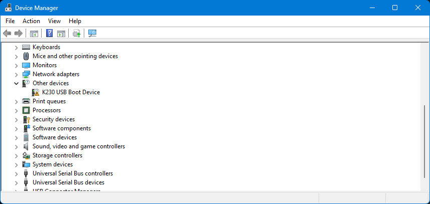 Сначала HUSKYLENS был выключен, нажата и удержана кнопка A, после чего устройство было включено. Перед отпусканием кнопки было выдержано не менее 2 секунд. При такой последовательности загрузки устройство определилось как K230 USB Boot Device, а не как HUSKYLENS.
