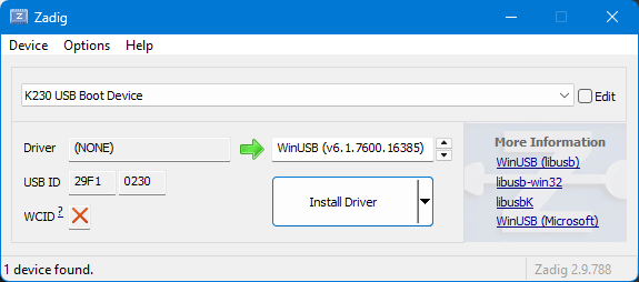 После этого был установлен необходимый драйвер с помощью Zadig , установка заняла около 30 секунд.