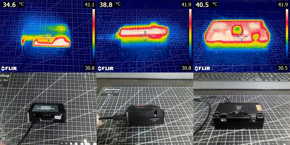 На следующих изображениях показаны тепловые изображения фронтальной стороны HUSKYLENS 2, полученные с помощью тепловизора FLIR E4. Наивысшая наблюдаемая температура составляла около 43.2 °C, при этом распределение тепла было относительно равномерным по фронтальному корпусу. На задней стороне наивысшая температура составляла приблизительно 38 °C и в основном была сосредоточена на правой стороне, что соответствует расположению модуля Wi-Fi на противоположной фронтальной стороне. Как показано на изображениях ниже, больше тепла наблюдалось на фронтальной стороне HUSKYLENS 2, что можно было явно ощутить при удержании устройства в руке.